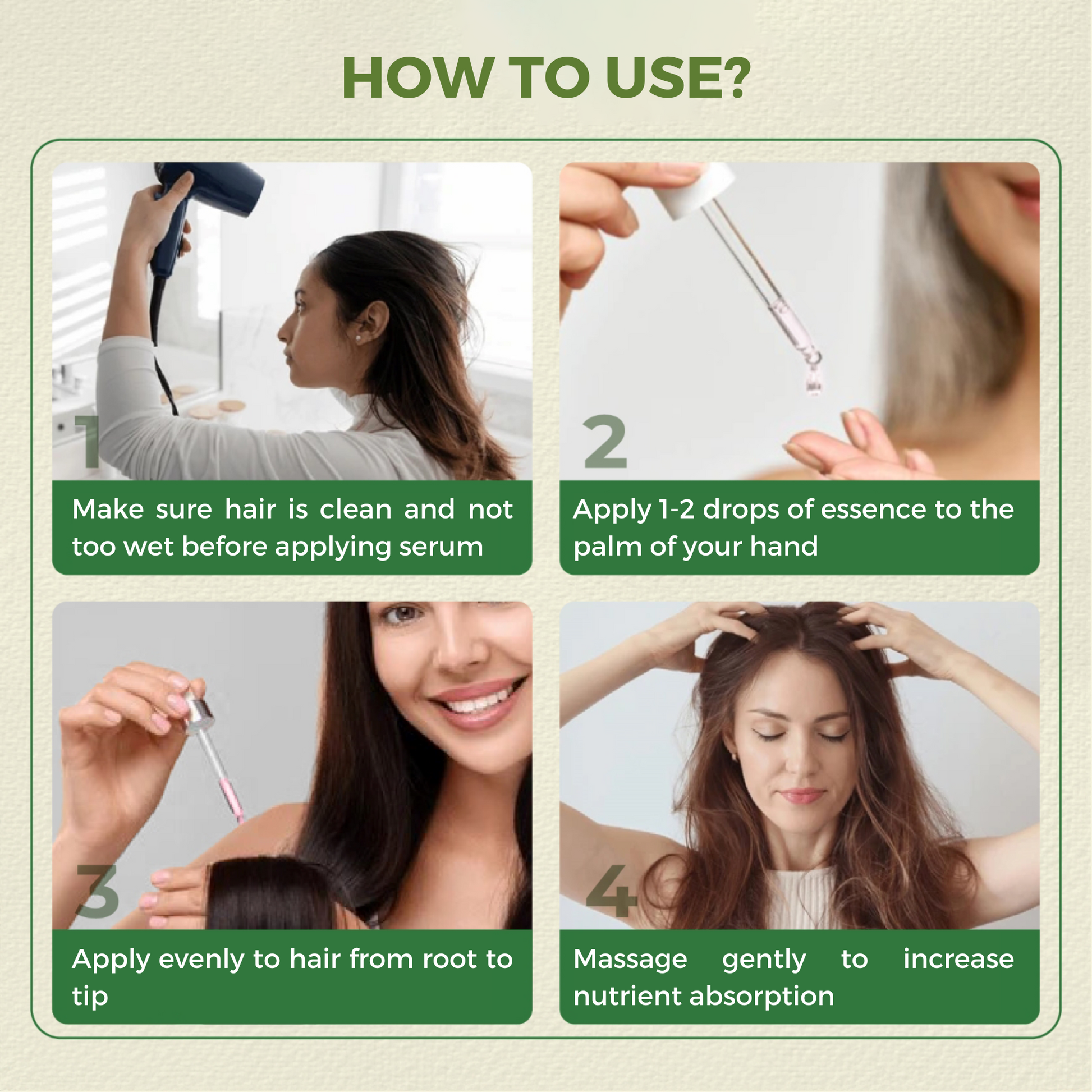 - Drop 1-2 drops of essence into the palm of your hand depending on the length and thickness of your hair.
